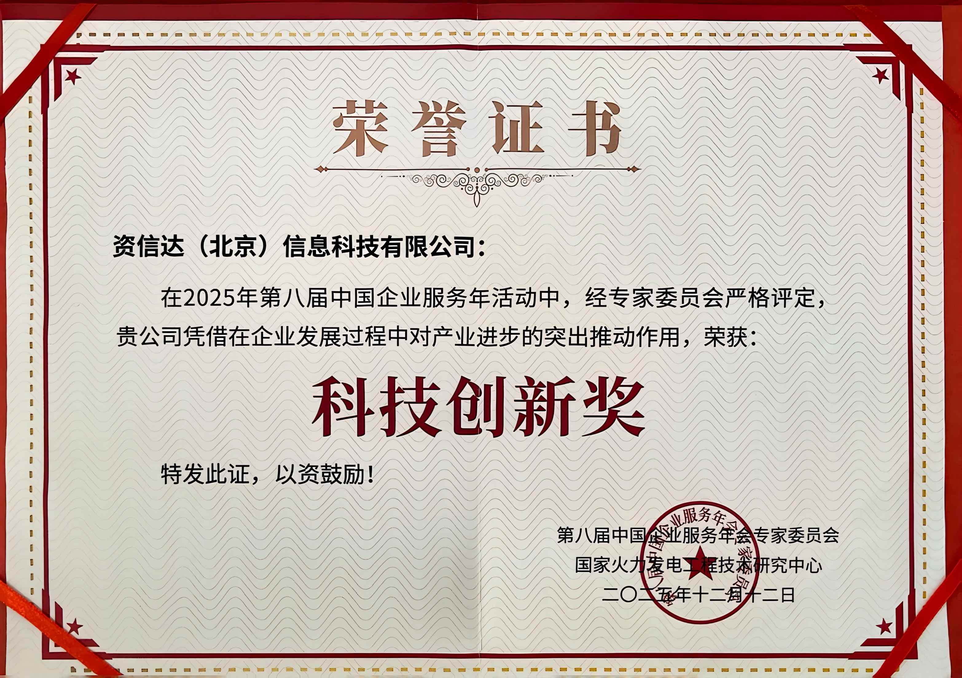近日,在2025年第八届中国企业服务年会上,资信达(北京)信息科技有限公司凭借其在企业发展过程中对产业进步的突出推动作用,荣获“科技创新奖”。该奖项由国家火力发电工程技术研究中心、第八届中国企业服务年会专家委员会联合颁发,旨在表彰在企业服务领域具有创新精神和行业贡献的优秀企业。